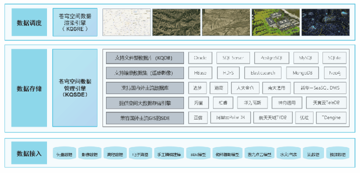 隨著空間數(shù)據(jù)獲取技術(shù)的發(fā)展,新時期地理信息數(shù)據(jù)呈現(xiàn)出種類多、體量大、更新快的特性。為了滿足用戶對海量空間數(shù)據(jù)的統(tǒng)一存儲和高效管理的需求,KQGIS研制出全空間數(shù)據(jù)管理引擎技術(shù),包含空間數(shù)據(jù)管理引擎、空間數(shù)據(jù)渲染引擎、空間數(shù)據(jù)分析引擎等內(nèi)容。